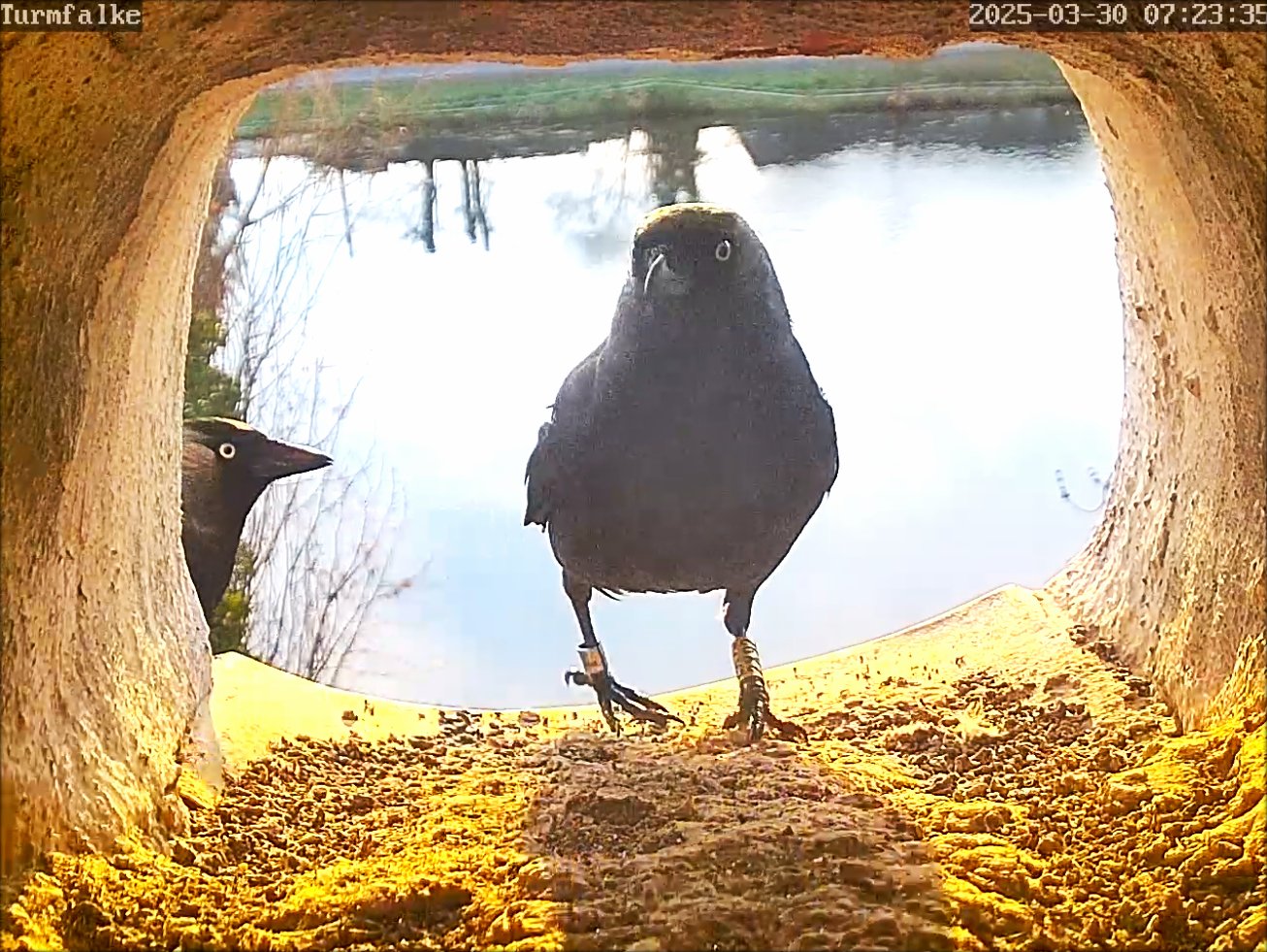 30.03.2025 - Seit gestern ist ein zusätzliches Dohlenpaar im Revier, offensichtlich gefällt ihnen der Falkenbrutplatz. Bei dem Wetter kann man ja schon mal schauen. Sie sind beide beringt, eine nur mit einem einzelnen silbernen Ring. Die Falken sind zwar wachsam, aber trotzdem versuchen die Dohlen später Nistmaterial einzutragen -> Video