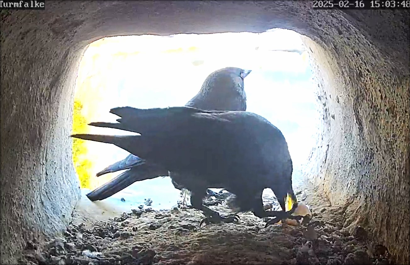 10.04.2025 - Heute habe ich die Stöckchen der Dohlen noch einmal entfernt, die Falken sind jetzt aufmerksamer und mit unseren Störradio können wir den Falken etwas helfen. Hoffentlich beginnen sie bald mit der Brut. Hier ein kleines Anflugvideo von den Beiden -> Video