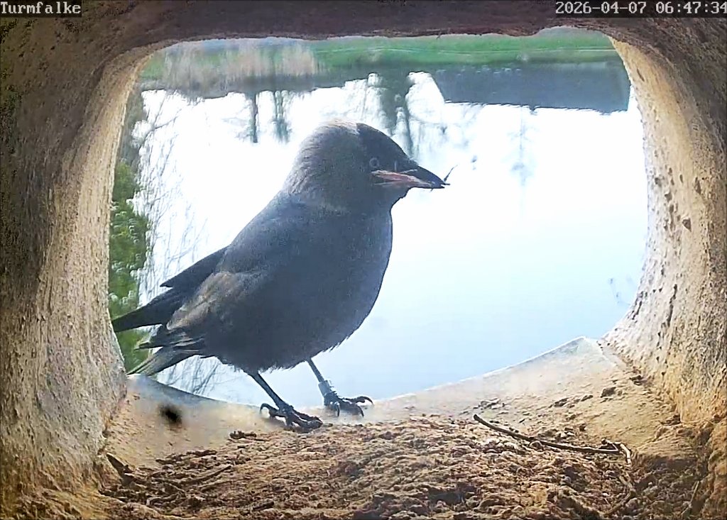 07.03.2026 - Am Kirchturm sind nun schon 2 Paar Dohlen. Eines davon hat sich den Turmfalken Nistplatz auserkoren um ihr Nest zu bauen. Sie schleppen soviel Material ein, dass schon die eine Nestkamera nicht mehr läuft, man sieht das Kabel herunter hängen. Die Falken haben so keine Chance mehr, ich werde woh etwas tun müssen um den Falken zur Brut zu verhelfen. Im Video sieht man die Aktivitäten gut -> Video