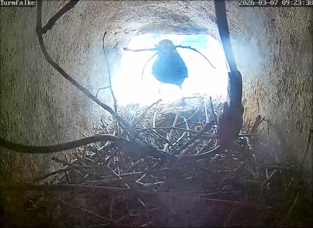 04.04.2026 - Nachdem der Einflug wieder frei ist, nehmen die Falken ihr Nest in Beschlag -> Video